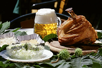 名物の グリルド・シュヴァインステルツェ(Grill‑Schweinsstelze)とビールを味わうことができます。(夏季限定営業)