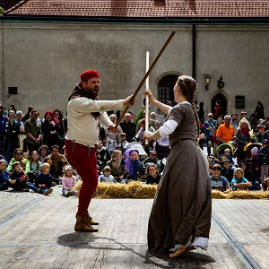 騎士の剣術ショー、マーケット、音楽と炎のショー、グルメも中世風。