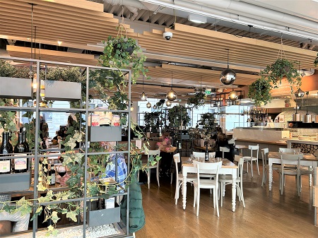 店内は大きな吹き抜けになっているのでとても開放的!2階から下のレストランを見おろすと、広場の真ん中のレモンの木を囲むおしゃれなカフェ、というイメージです。