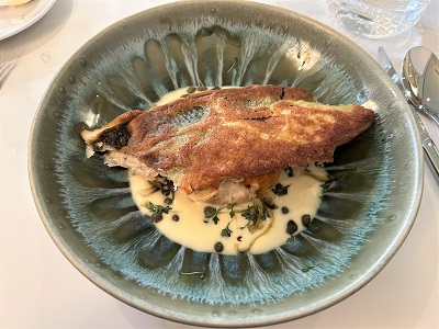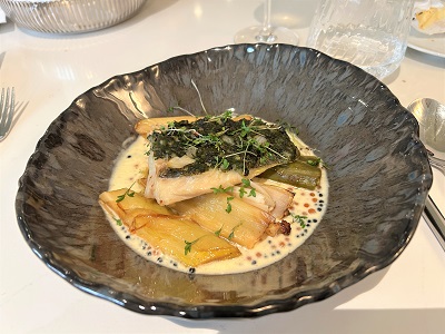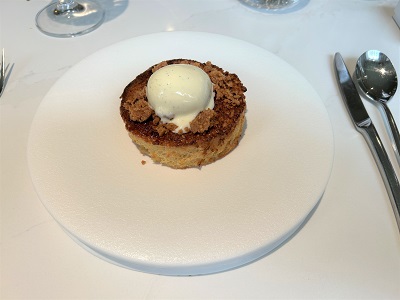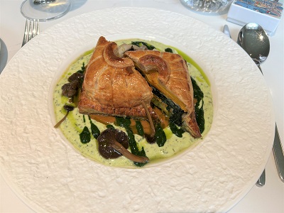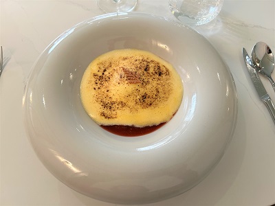シェフが再解釈したコルドンブルーは美しい盛り付けで、黄色ワインのソースと良く合い、クリーミーなポレンタと一緒にいただきました。