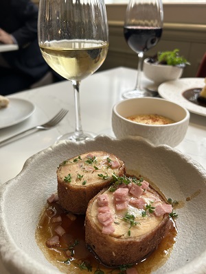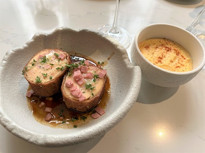 鴨のパテ・アン・クルートと鴨のフォアグラをマルメロのコンフィチュールと一緒に口に入れると、さわやかな味わいで食が進みました。