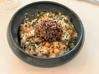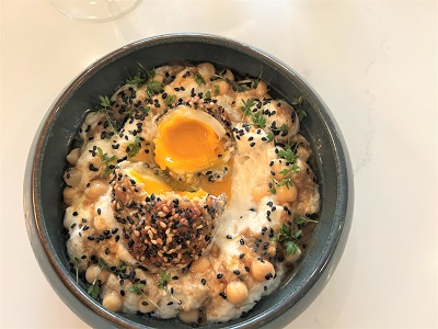 軽いゴマのフムスにピリッとした鶏肉のソースが良く合い、食べ応えのある一品です。