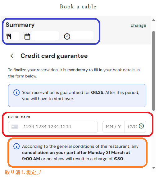 この場合、「3/31(月)の9:00AM以降のキャンセルまたは来店されない場合、80EURのキャンセルチャージ。」と記載されている。