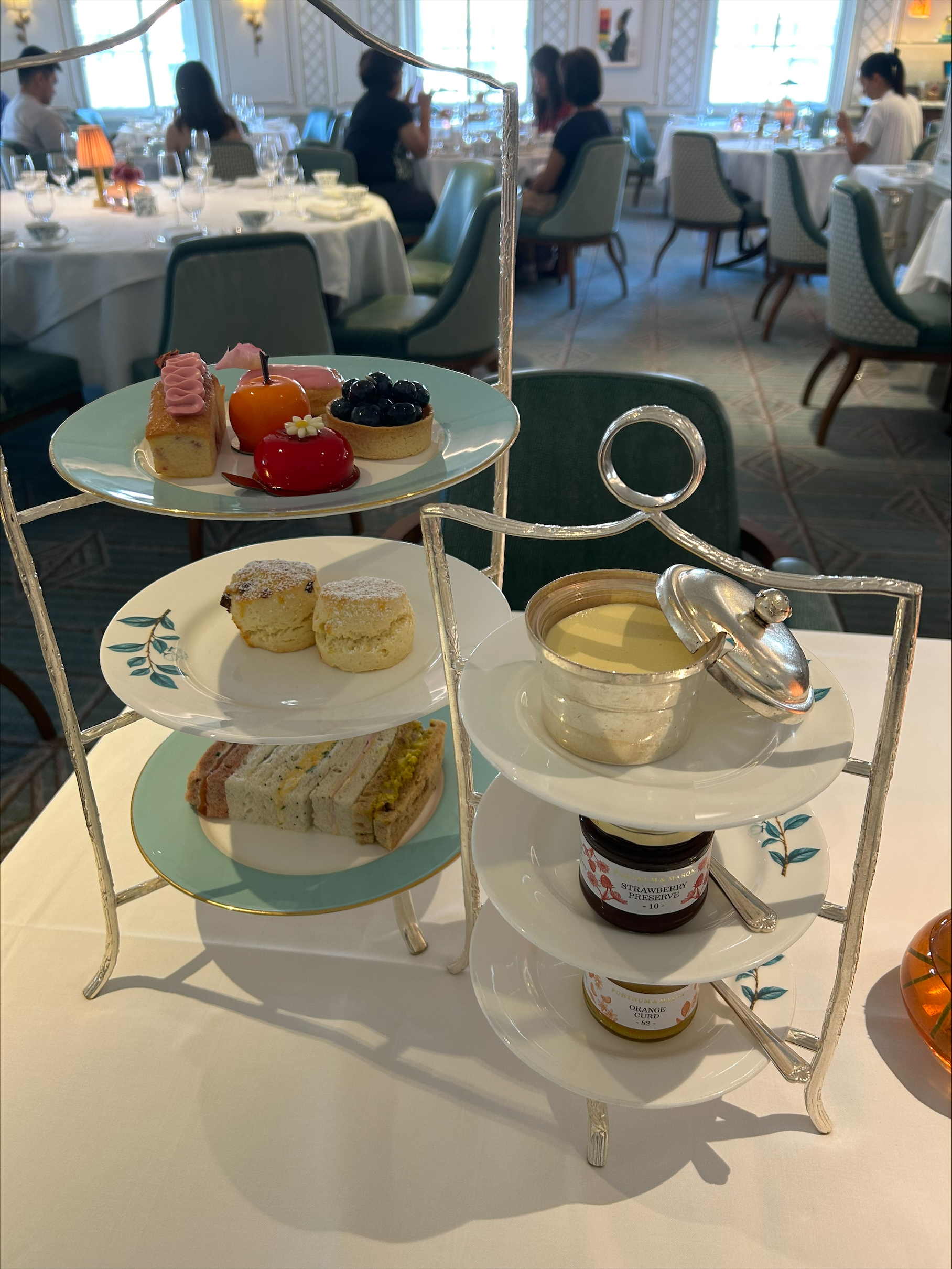 3段のティースタンドにケーキ、スコーン、サンドイッチが乗せられたクラシックな組み合わせで、どれも美味しくて非常に満足感があります。