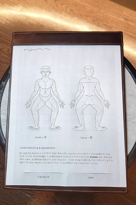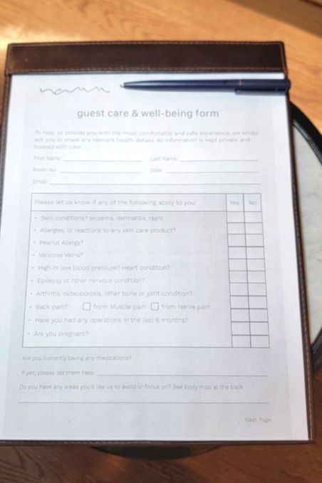 🖋スパに着いたらまず、健康状態に関するアンケートの記入をします。