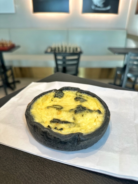 炭の生地がユニークで、香ばしさとほのかなスモーキーさが感じられるキッシュ。