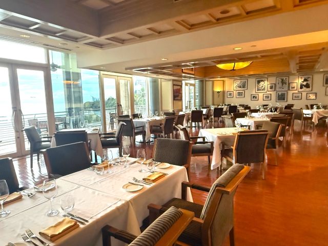 大きな窓からはグアムの青い海を一望でき、落ち着いた雰囲気の中でゆっくりとお食事を楽しめます。