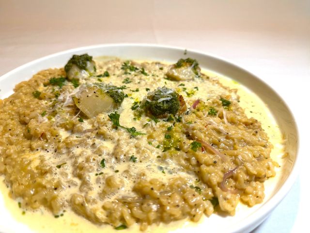 サフランの豊かな香りと上品なコクが、ホタテの甘みとよくあう🍴ロブスタークリームの軽やかな泡が加わることで、見た目も華やかで味わいに深みが増したひと品🥘