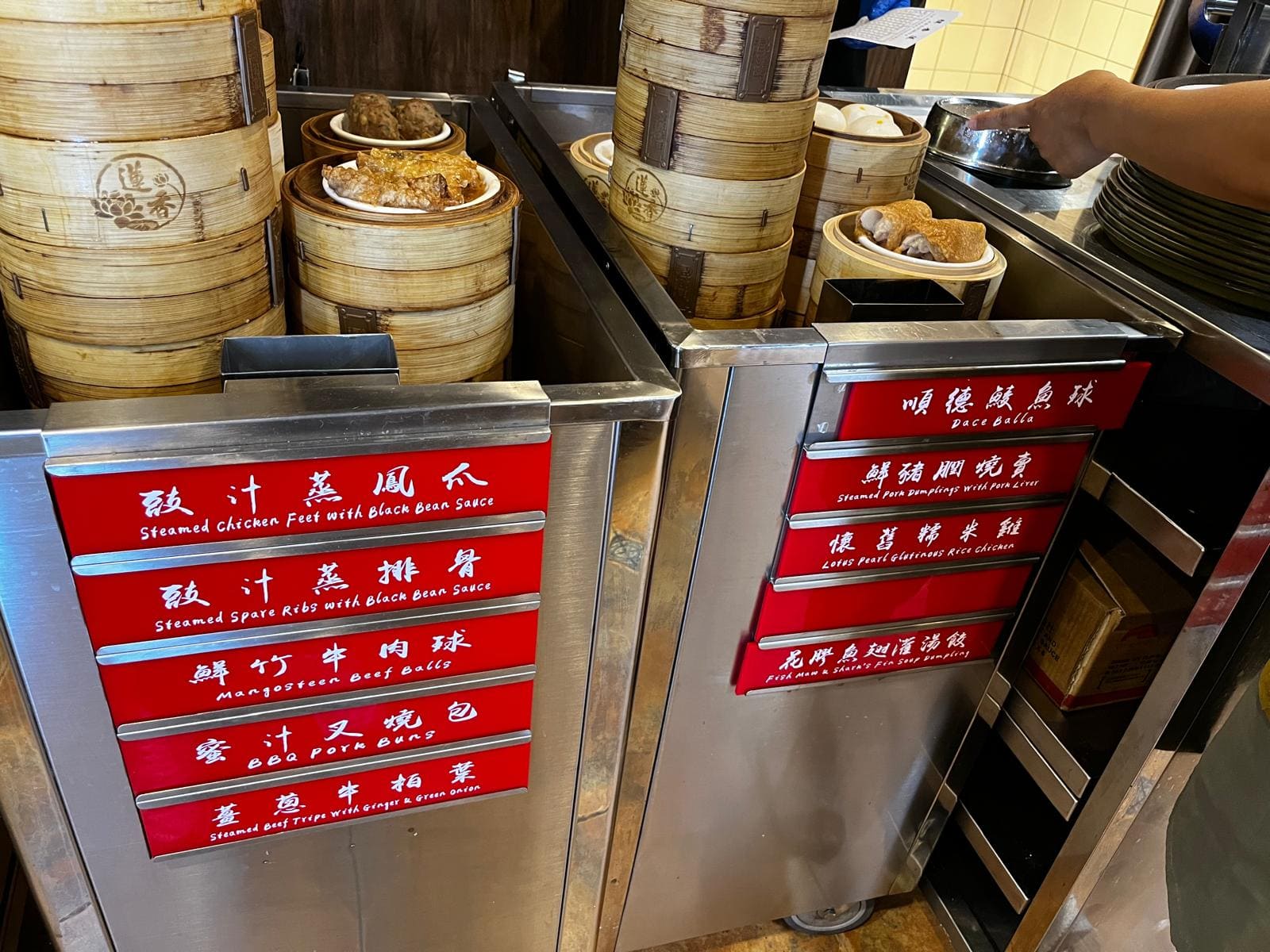 店内を巡回するワゴンから好きな点心を選ぶことができるって、楽しいですよね。高く積まれたセイロから、お好きな点心を選んでください。