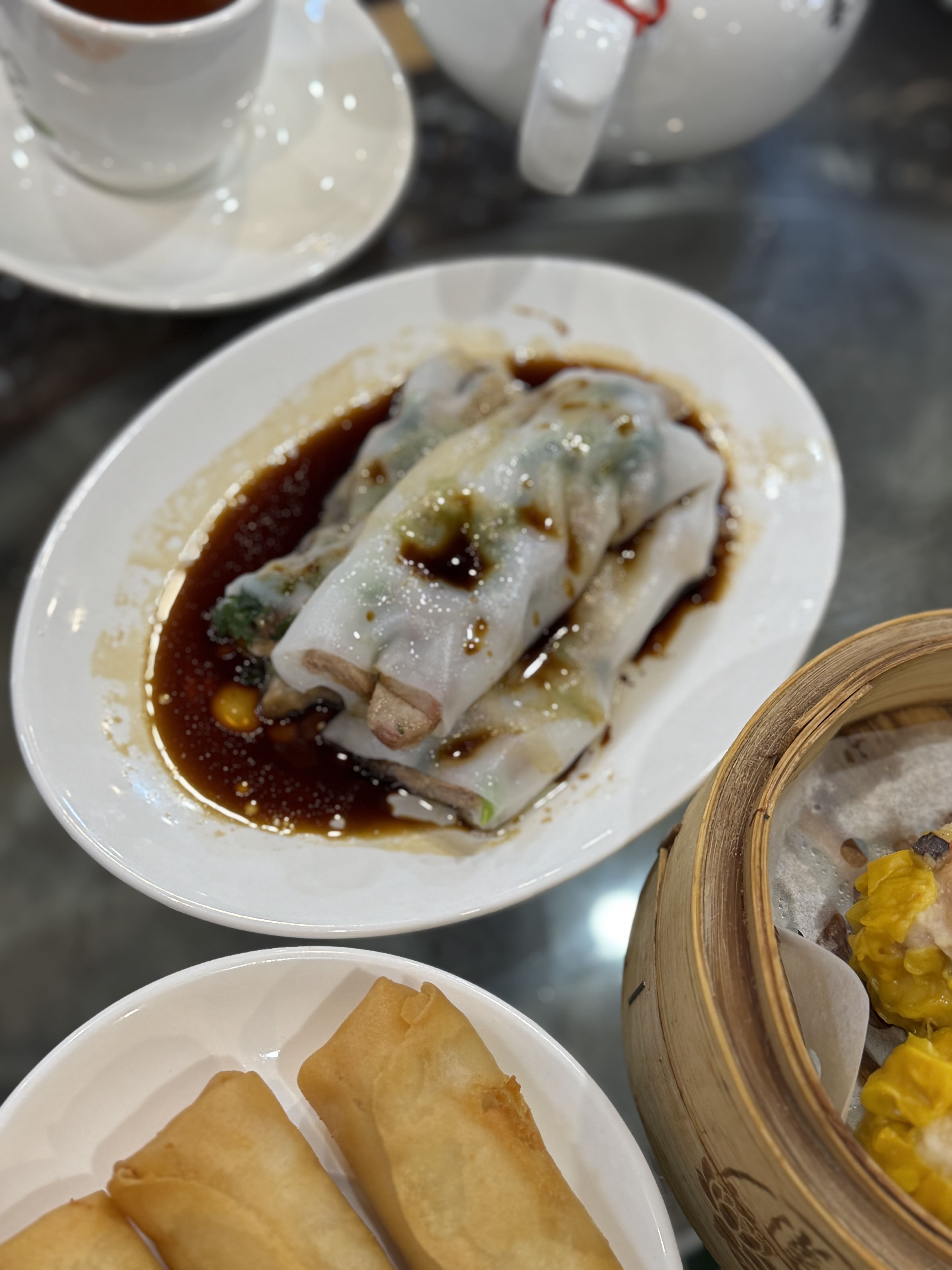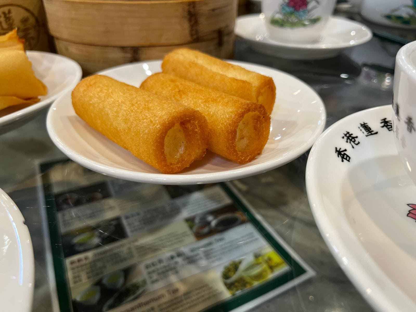 春巻きのような点心は通称「揚げミルク」。甘いミルク餡を衣につけてカラッと揚げた、熱々のデザート。