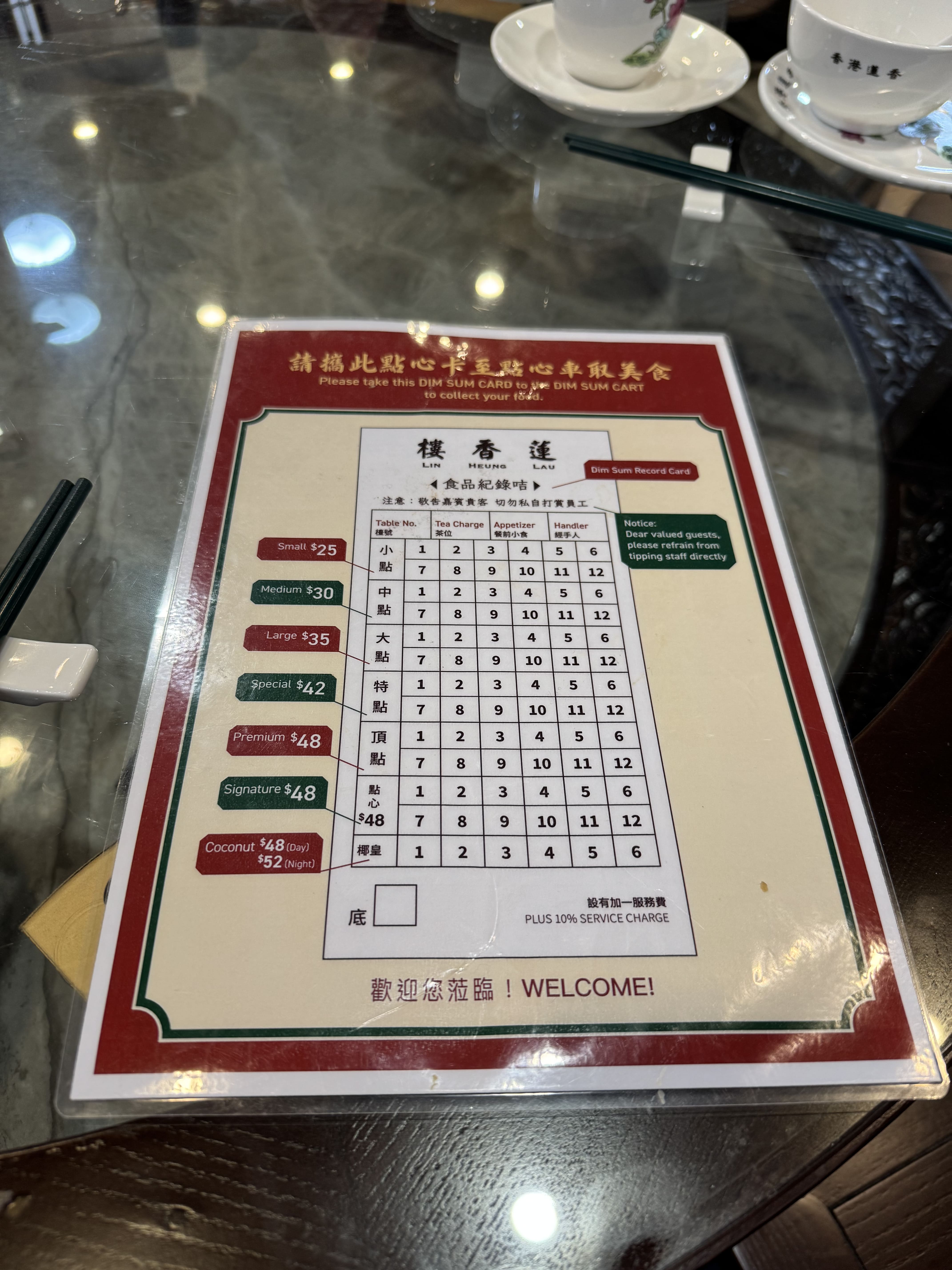 まず着席すると店員がテーブル番号を書いた點心紙(注文票)を渡してくれます。店員さんからお茶の種類を聞かれるので、好きなお茶を注文しましょう。