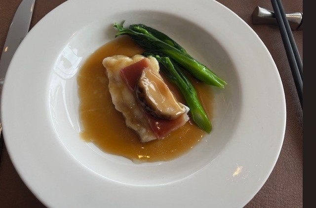ハタ科の高級魚ガルーパのフィレに、塩気のある雲南ハムと厚切りの中国産きのこが
