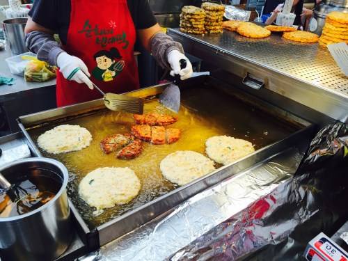メインストリートを中心にさまざまな屋台が出ていますが、なかでも有名なのが麻薬キムパッとチヂミ。
