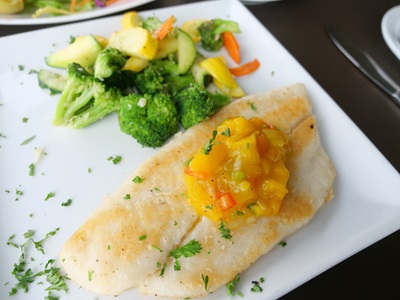 グリルした淡水魚のバサにマンゴーサルサソースが添えられています。淡白な白身にさっぱりしたソースがよく合います。ソテーされた野菜がサイドについてきます。