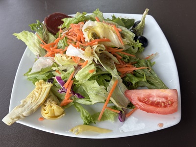 アメリカではポピュラーなオリーブ、ビーツ、アーティチョークと一緒にミックスグリーンをイタリアンドレッシングでいただきます。
