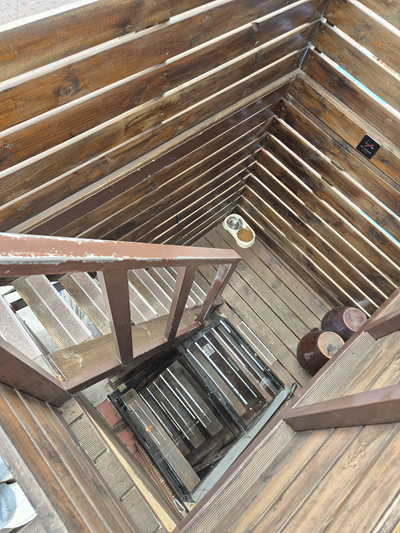 (写真から見える窓口を開けて出て階段を上ります。)