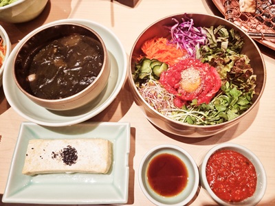 「ユッケビビンバ」は単品でも頼めますが、定食にするとスープやおかずが出ます。