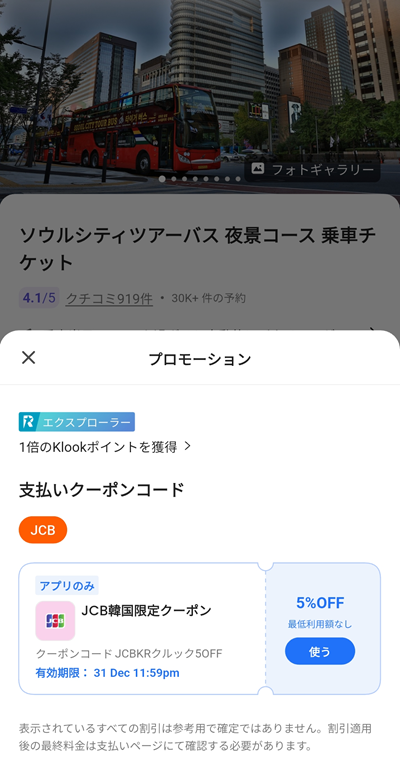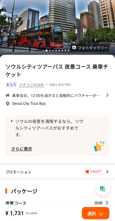 ① Klookアプリで【ソウルシティツアーバス 夜景コース】を検索