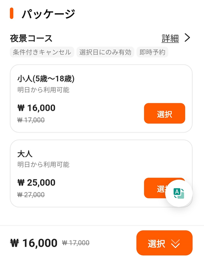 ② 詳細ページ →【パッケージ】で大人/子どもを選択