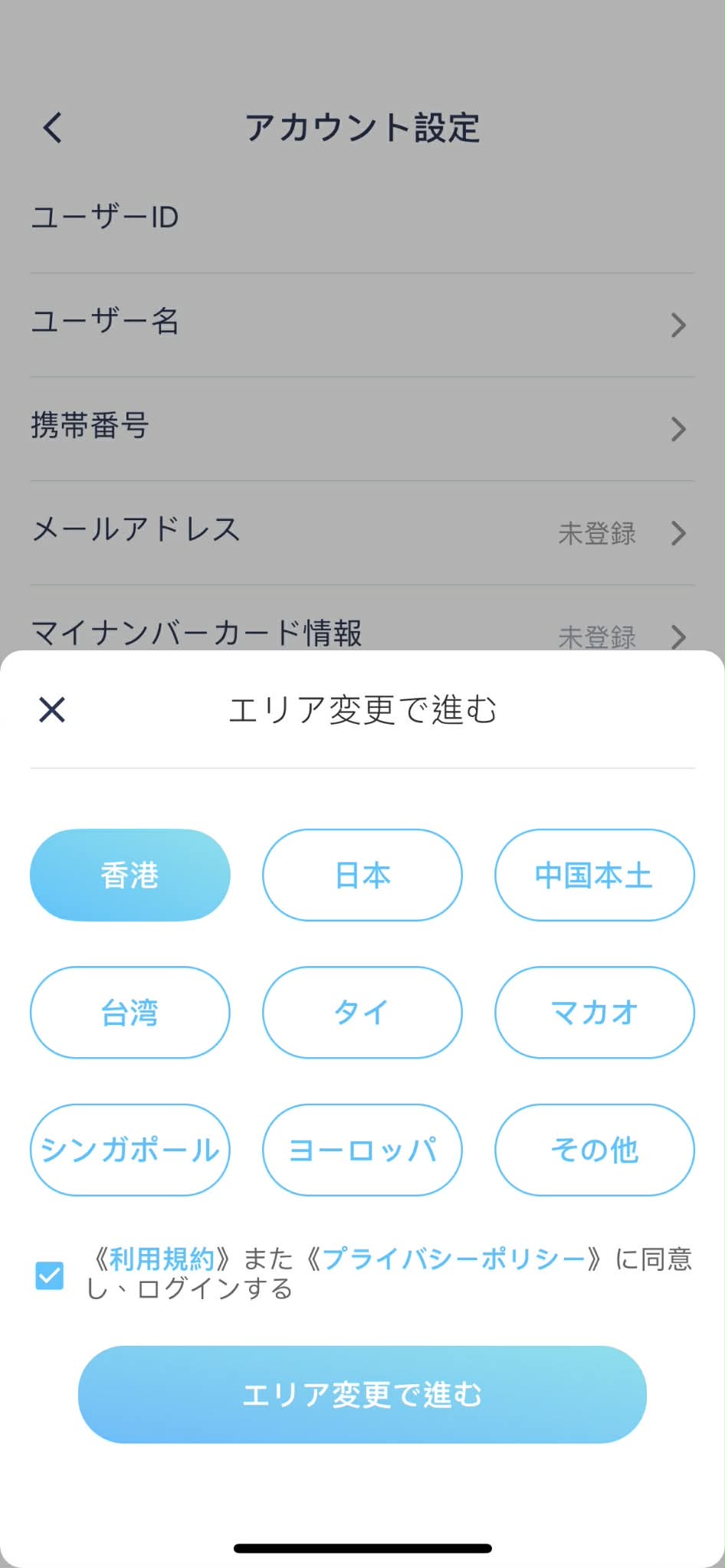 【マイページ】>【アカウント設定】>【エリア変更】から【香港】を選んでください。