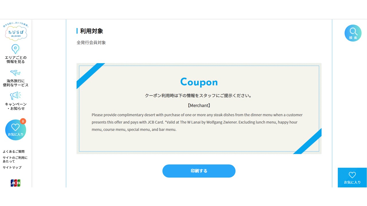 気になるお店のページを開く→ページ中段の「Coupon」の下の「印刷する」ボタンを押す→クーポンを印刷→現地のお店スタッフへ提示