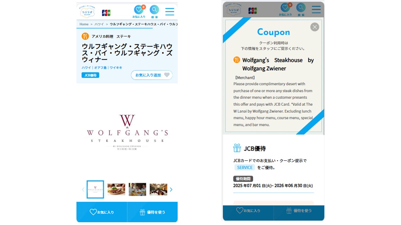 気になるお店のページを開く→ページ中段の「優待を使う」ボタンを押す→「Coupon」画面をスクリーンショット→現地のお店スタッフへ提示