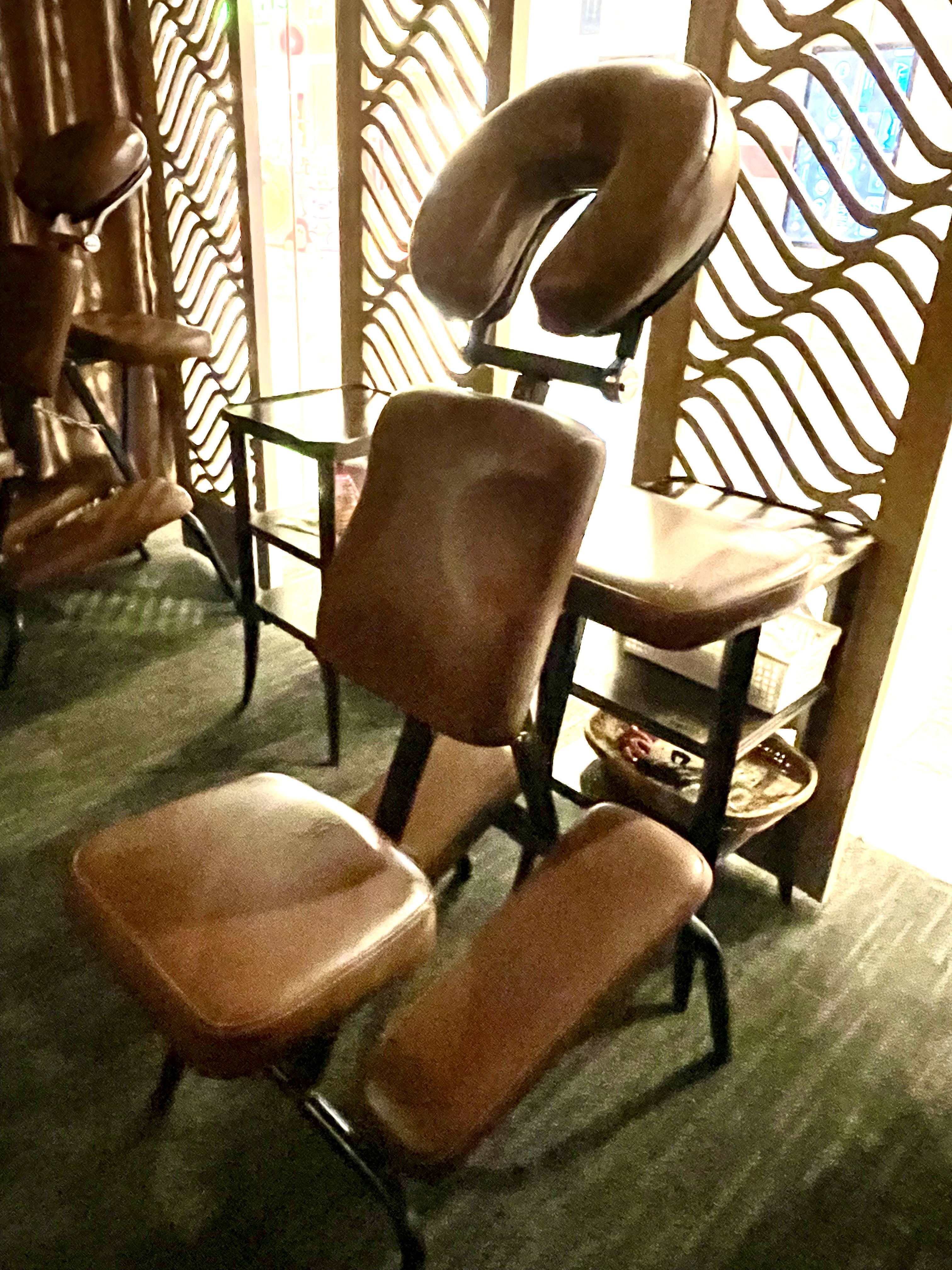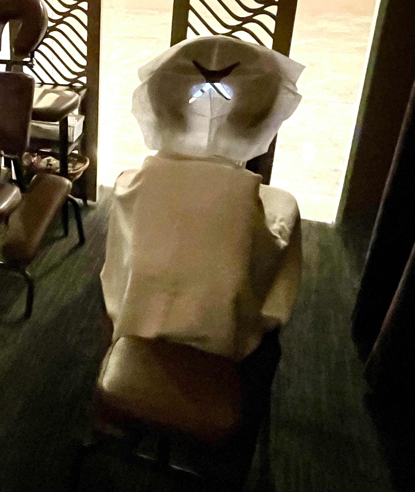 マッサージチェアにはタオルが敷かれ、顔を置く