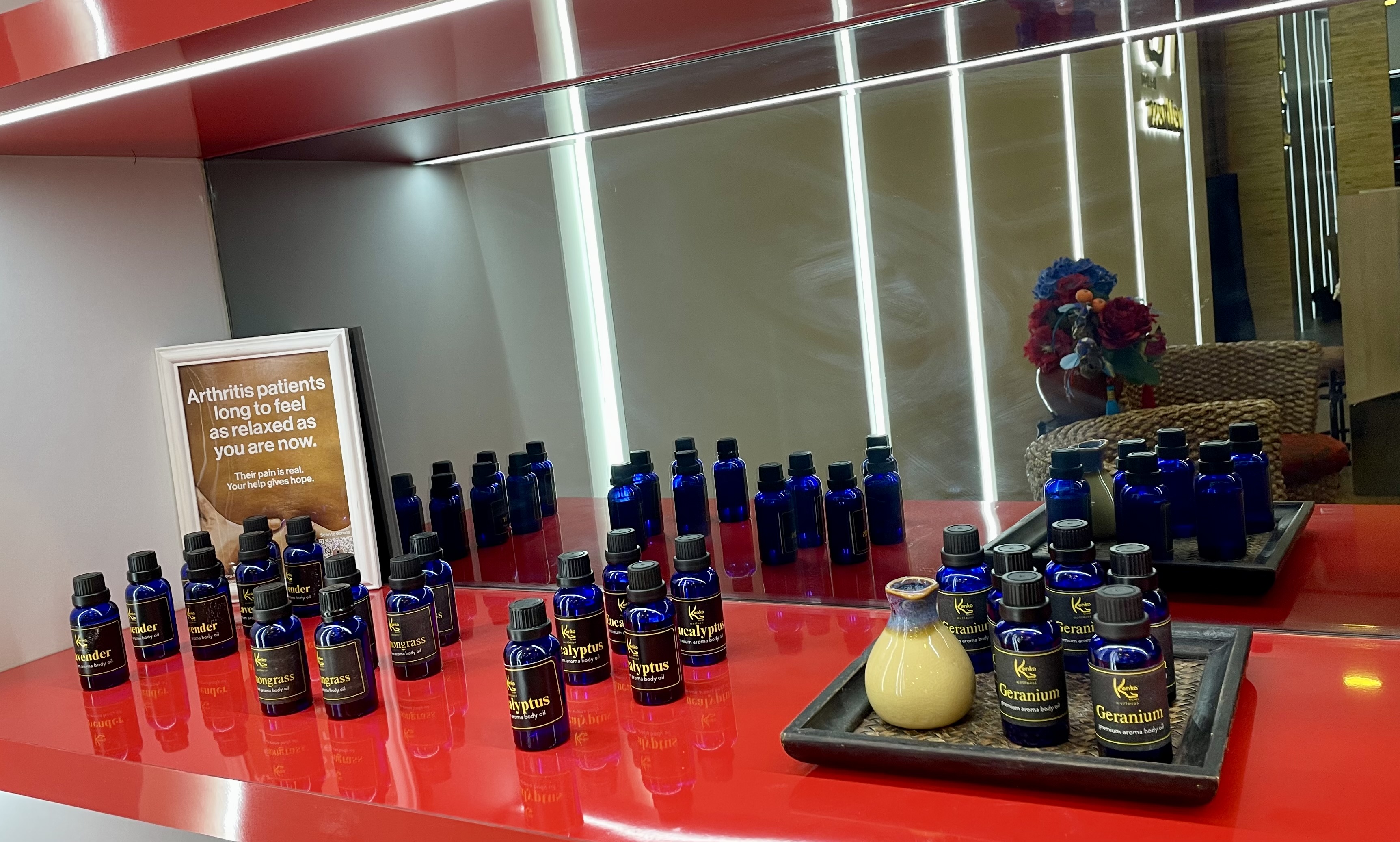 店頭では、ヘッドマッサージスティックやボディーオイル、アロマディフューザー、ブランケット等、リラックスタイムに最適なアイテムが取り揃えられています。(商品の価格については店舗スタッフまでご確認ください。)