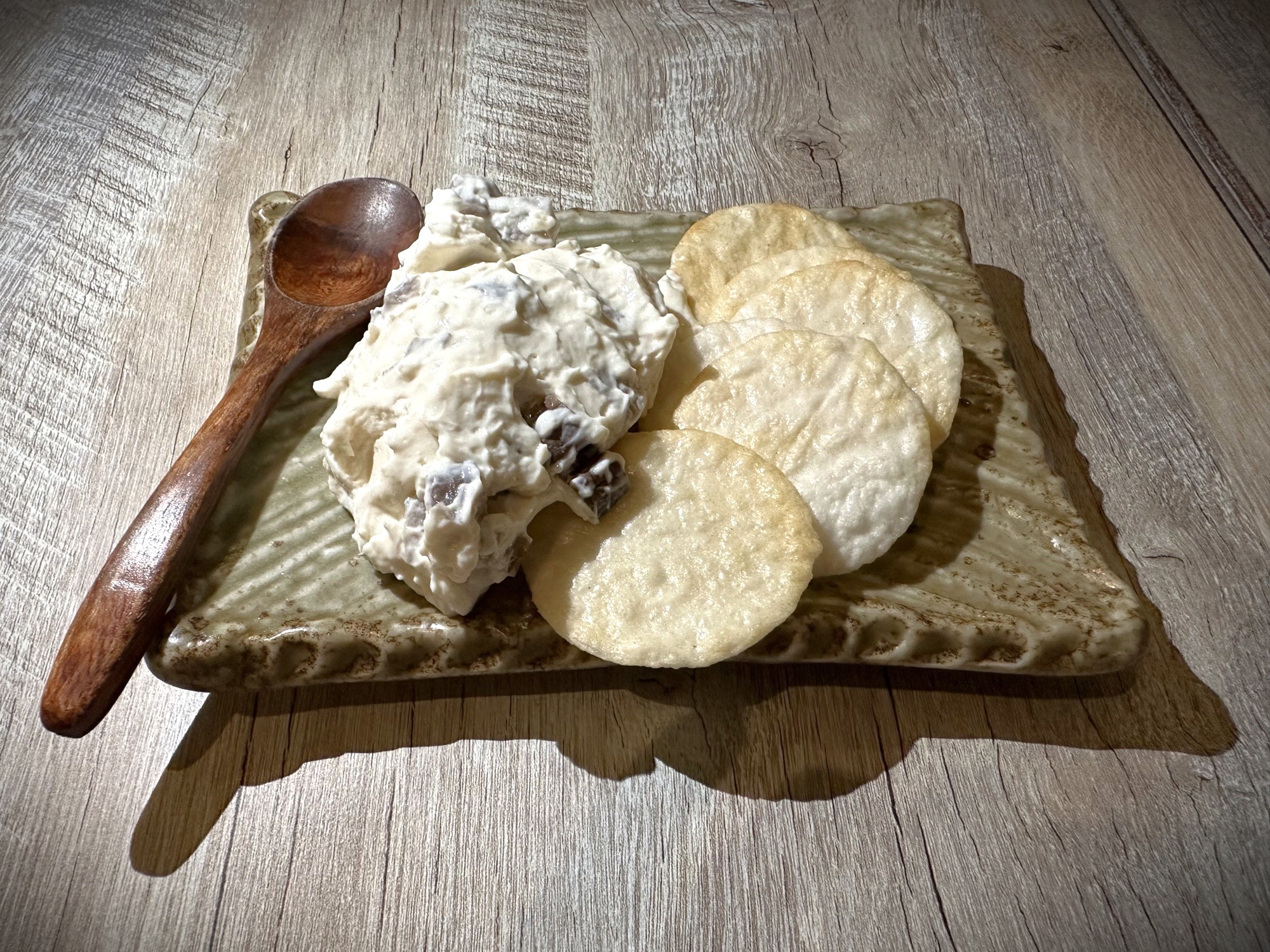 「いぶりがっこチーズ」S$16は一度食べたら止まらない一品!漬物のカリカリ食感と濃厚クリームチーズのねっとりしたくちどけが交互に楽しめます。サクサクミニせんべいに乗せていただきます。