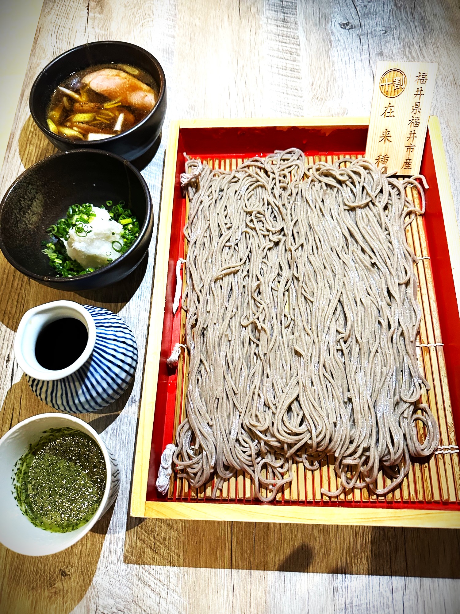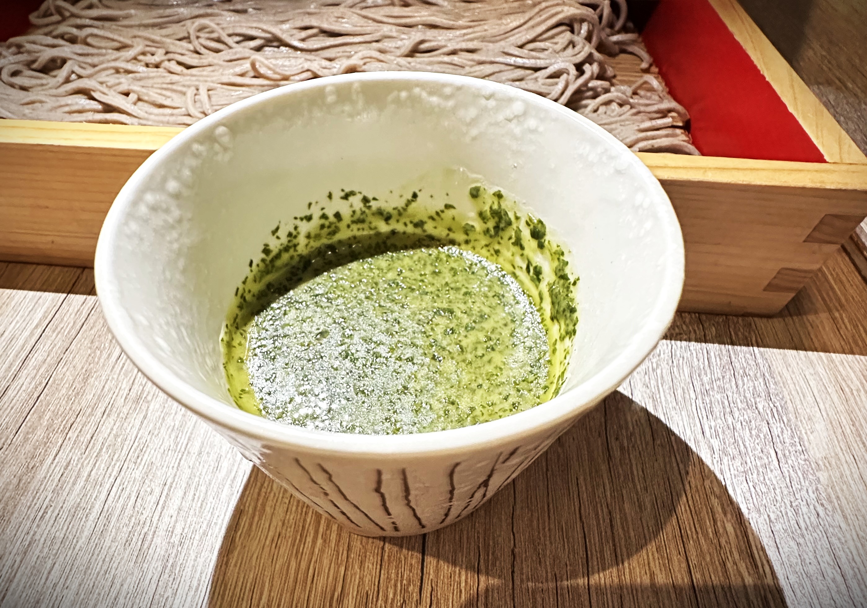 鮮やかな つゆの色を楽しみつつ、爽やかなバジルを彷彿させる紫蘇の風味が蕎麦と絡まります。