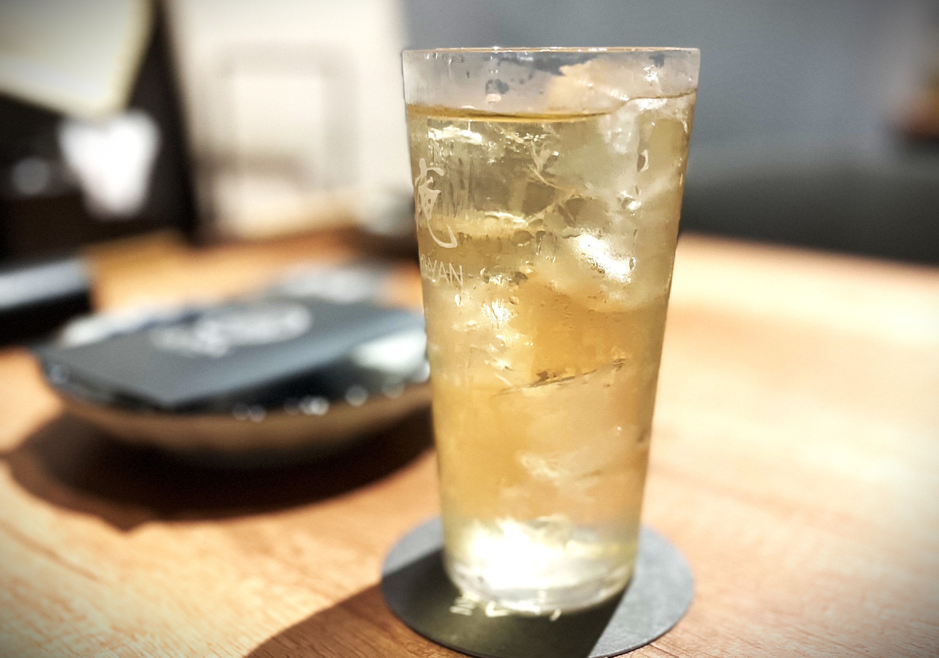 「韃靼(だったん)そば茶割り」S$12は蕎麦の風味がしっかり楽しめる焼酎割り。蕎麦好き焼酎好きにはたまらない「韃靼(だったん)そば茶割り」 を飲みながら十割蕎麦やタパスをいただく至福のひと時。