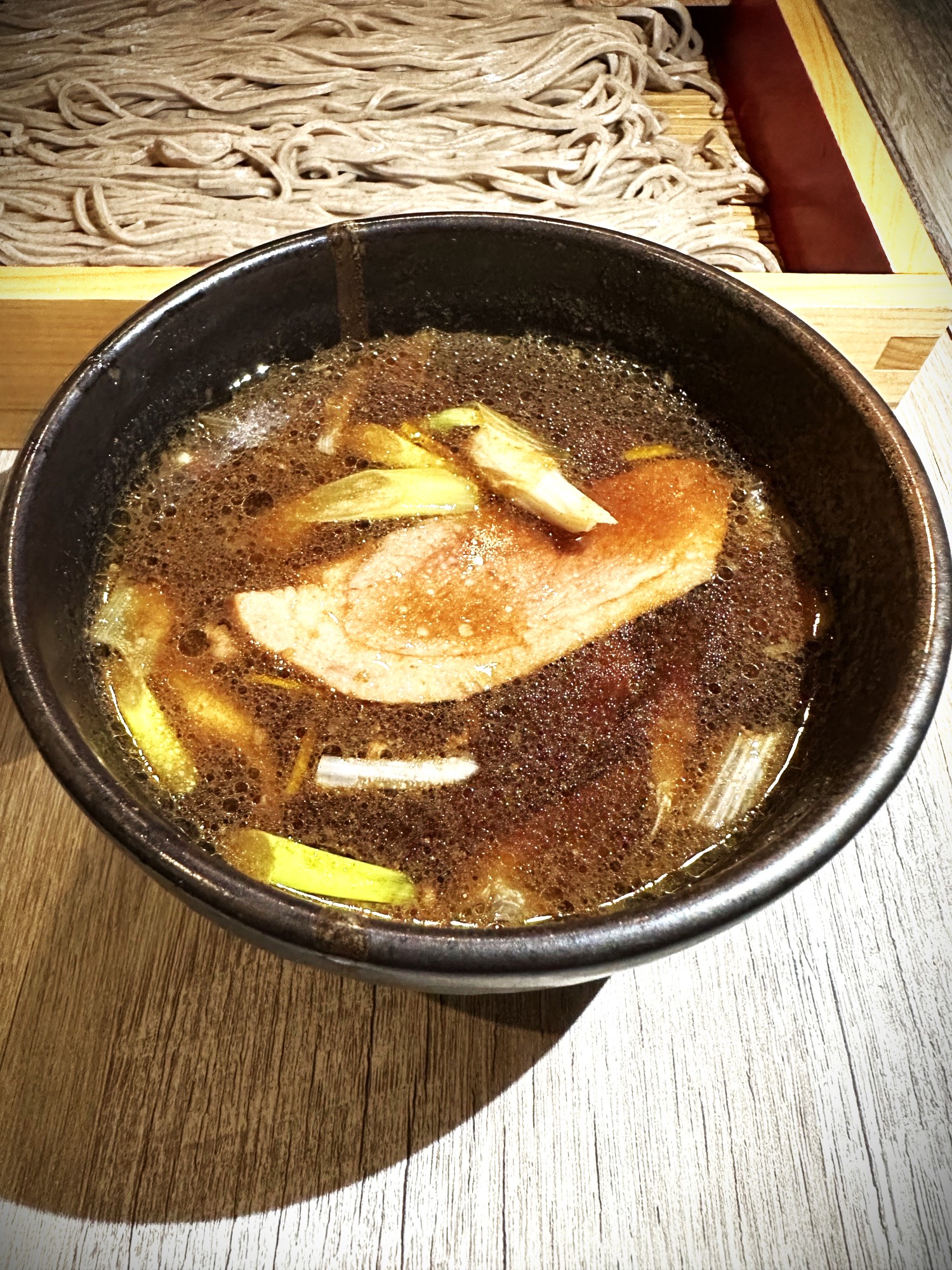 運ばれてきた時の香りでそのおいしさが伝わってきます。出汁の効いたつゆに自然な甘みのネギと柔らかい鴨肉がたっぷり。お腹ももたれず満足感のあるつけ蕎麦です。