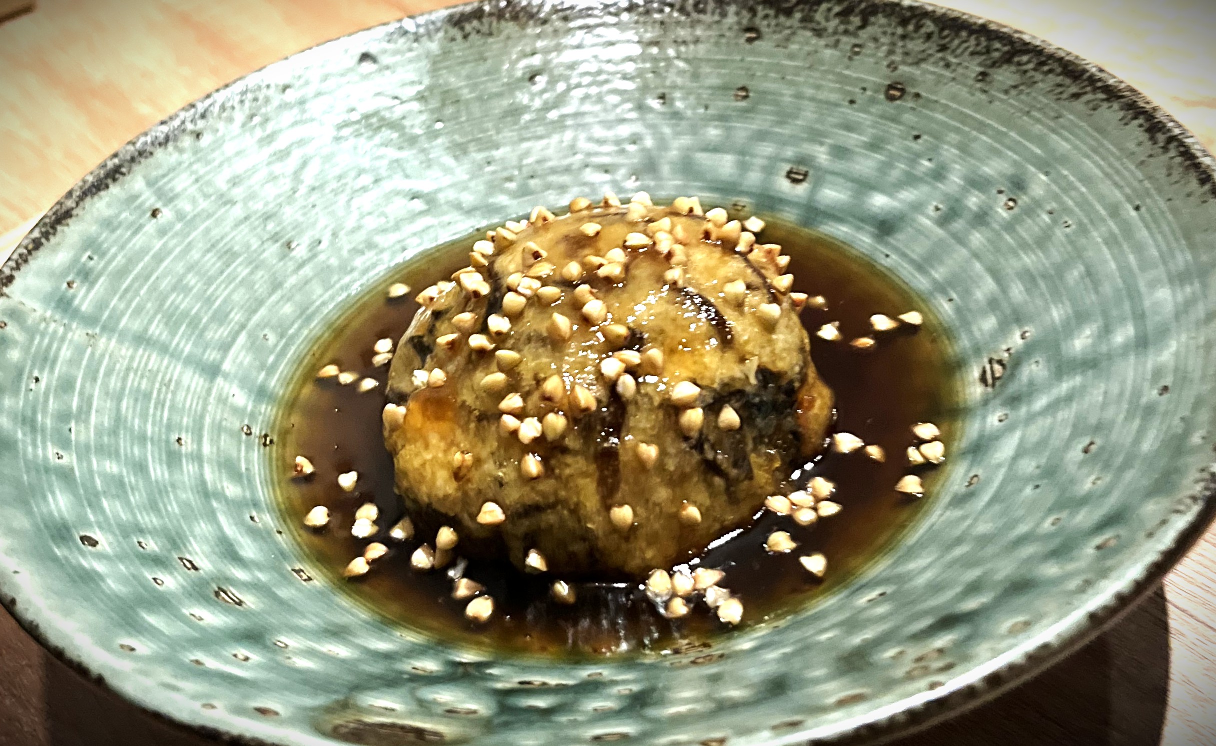 「とろとろ蓮根まんじゅう」S$16はトッピングされた香ばしい蕎麦の実のカリカリ食感がアクセント。とろとろ餡がたっぷりかかった蓮根まんじゅうのシャリシャリ食感と、ジューシーなお肉のハーモニーを味わえます。