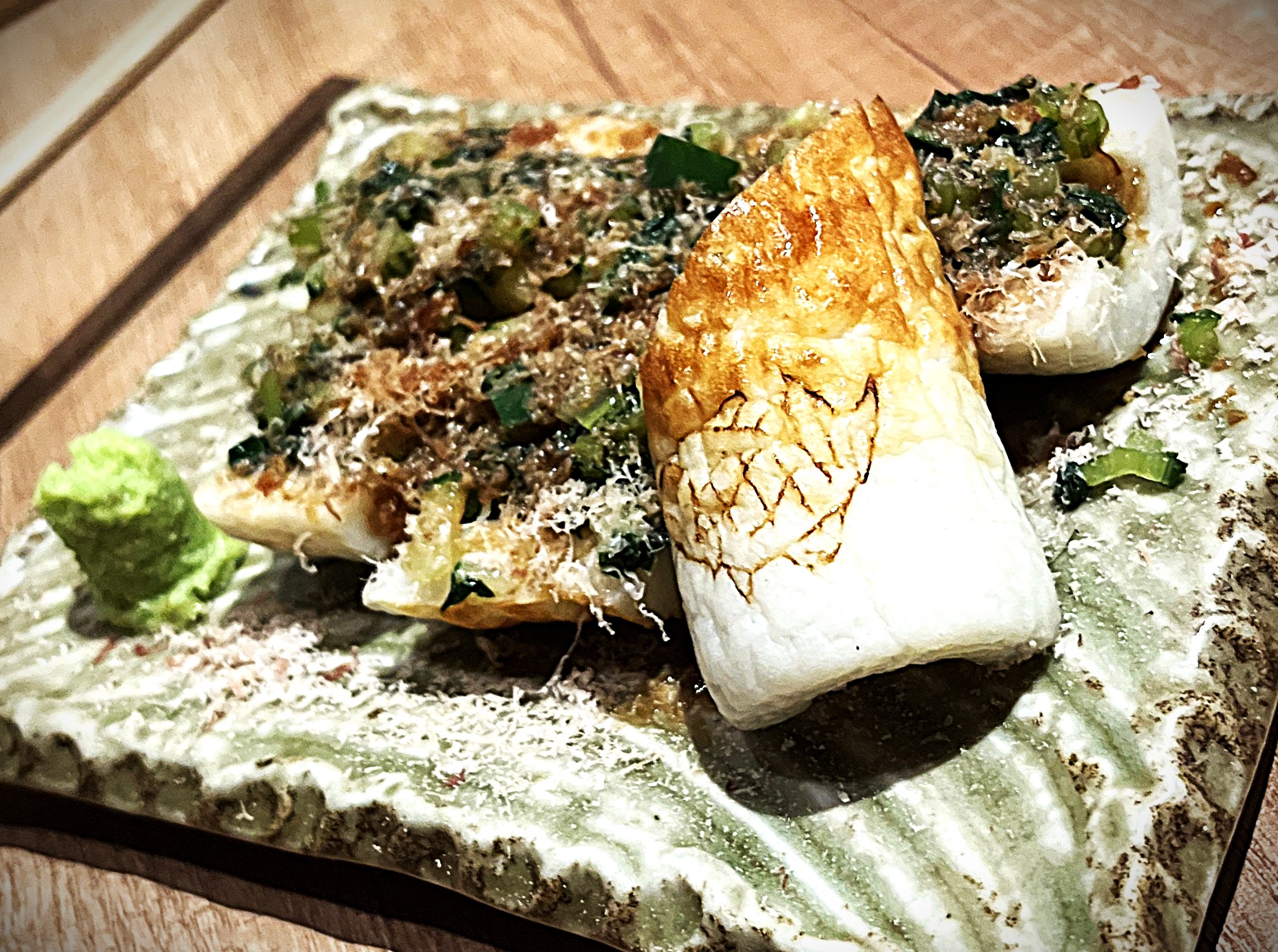 竹輪の焼き印ロゴが可愛いアクセントの「鯛ちくわの”板”わさ」S$17。優しく上品な鯛の風味が広がり箸休めにもぴったり。お酒をいただきながら味わいたい一品。