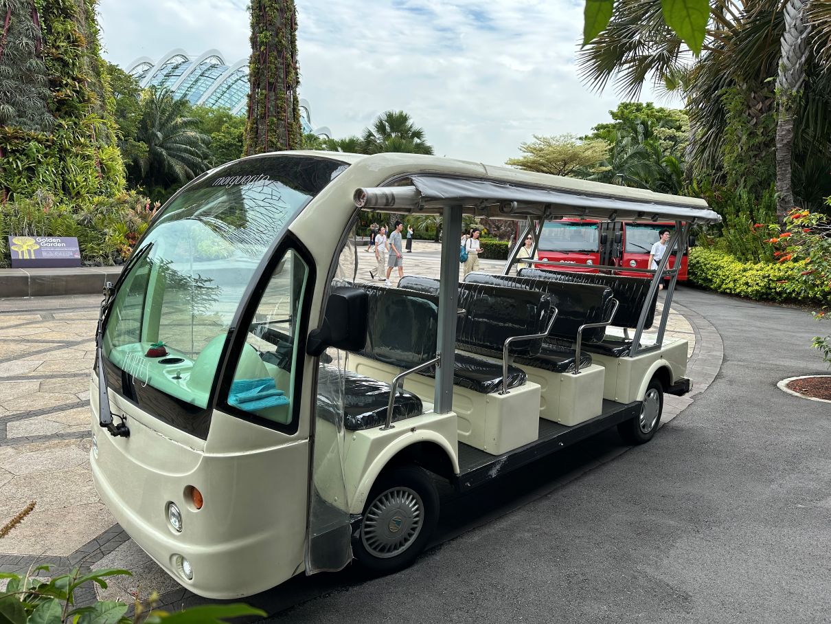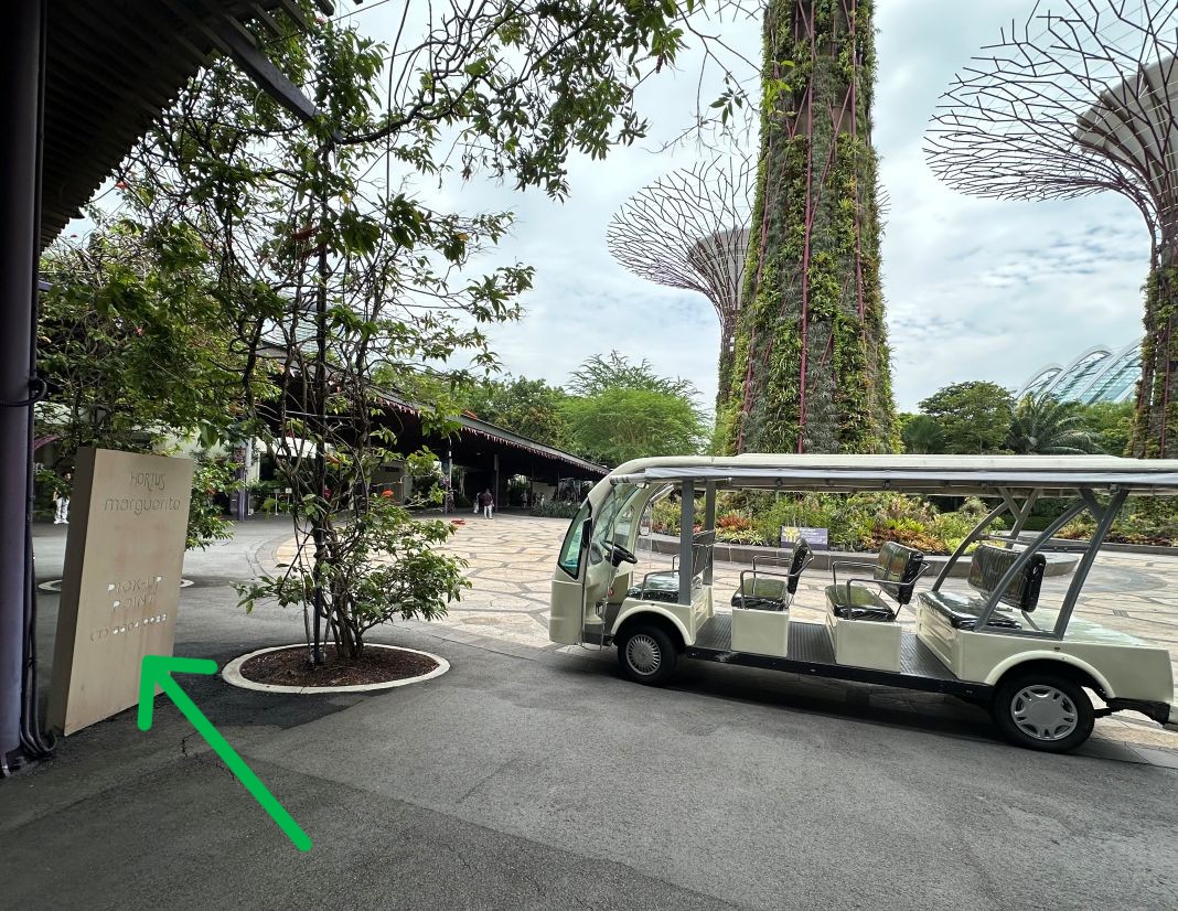 事前にオンライン予約をするだけで、ガーデンズ・バイ・ザ・ベイの正面入口からフラワードームにあるレストランまで無料のカート送迎サービスを利用できます。歩いても10分程度の距離ですが、常夏のシンガポールで屋根付きカートに乗れるのはありがたいですし、ちょっぴりリッチな気分も味わえます。カート乗り場はガーデンズ・バイ・ザ・ベイのZone 1(オレンジゾーン)にあり、写真のような掲示板が出されているのでわかりやすいです。カートは約10分間隔で運行しています。