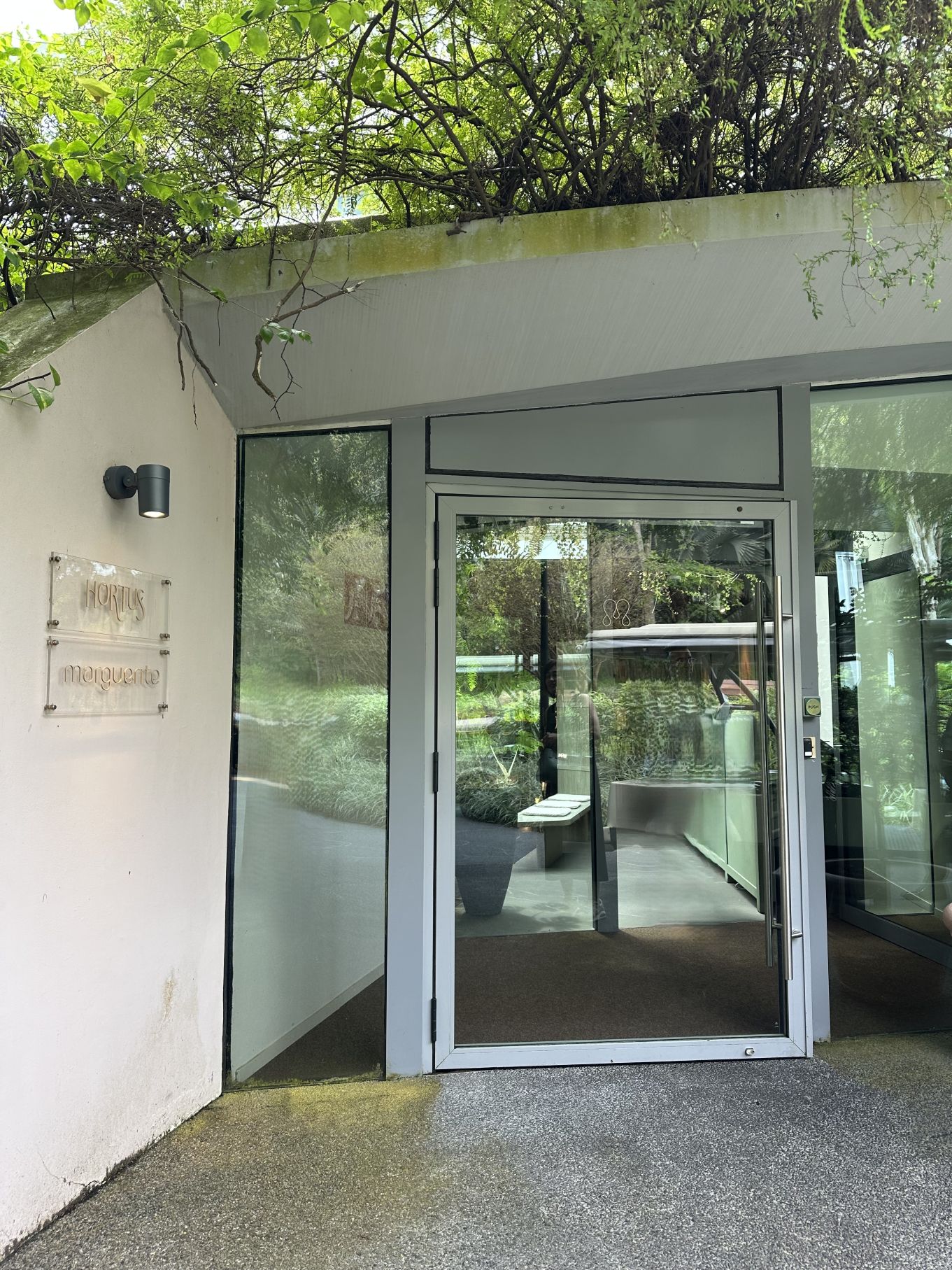 <カート送迎時のフラワードーム外側のエントランス>左上のガラス板にホータス(Hortus)の店名が表示されています。