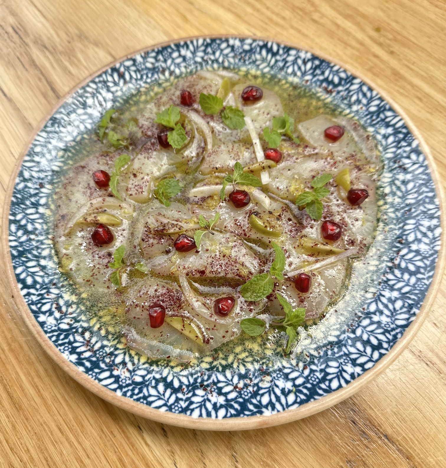 ベルガモット、ミント、グリーンオリーブ、ザクロを添えたヒラマサのクルード(生魚のカルパッチョ風)