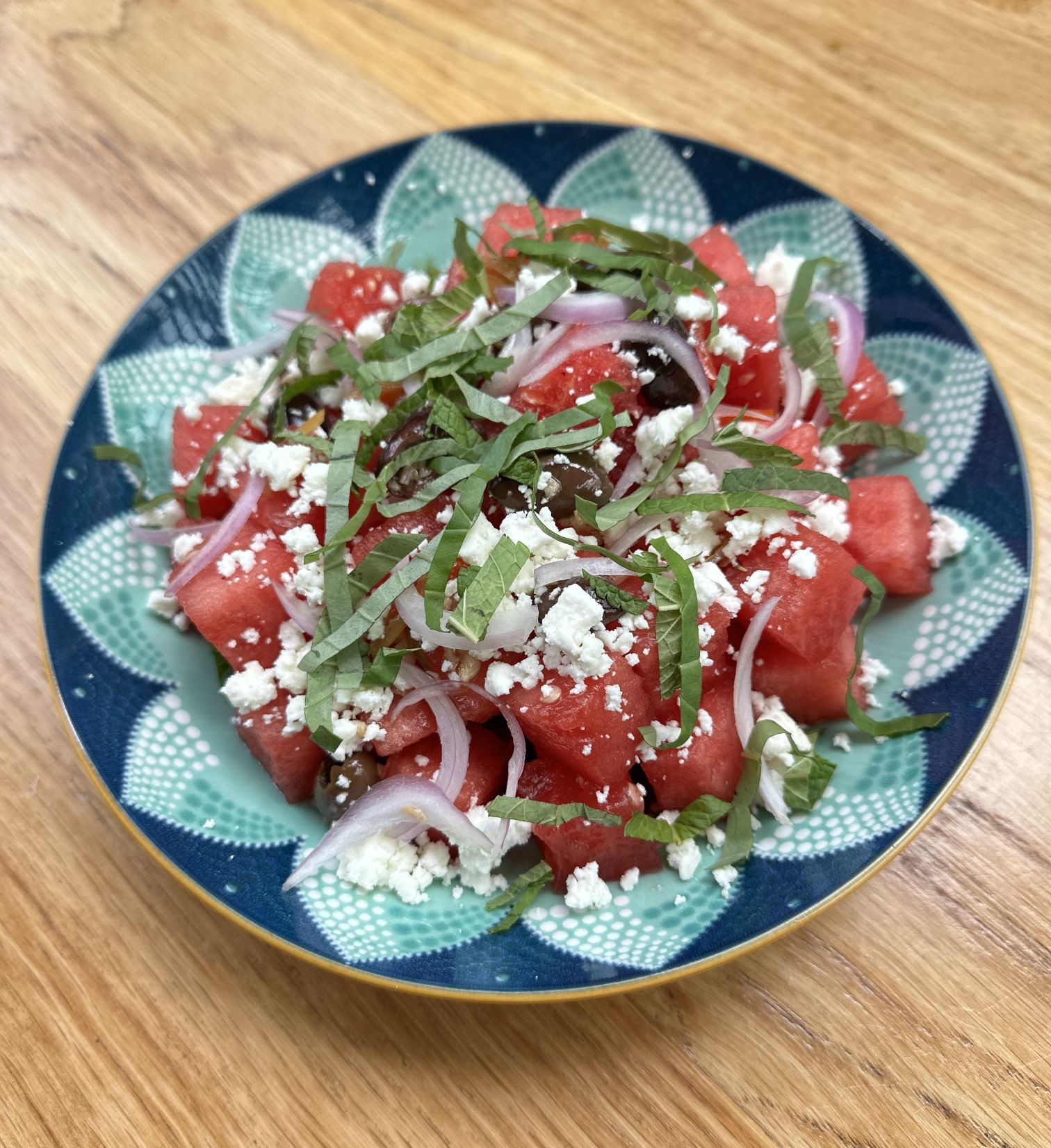 (カラマタ産オリーブ、塩レモン、ミントを添えたスイカのサラダ)