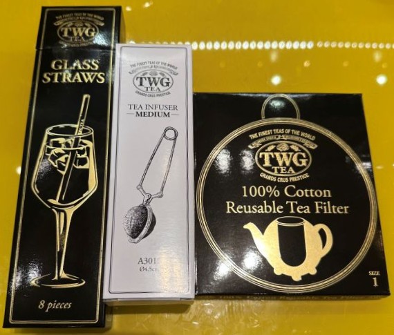 このほかTWGのサロンでも使われているガラス製ストローやティースクープ(茶さじ)、ティーインフューザー(茶こし)、コットン製ティーフィルター(3点ともに写真右下)といった小物類も、おしゃれで実用的なギフトとして喜ばれそうですね。