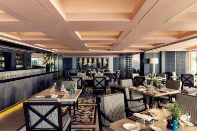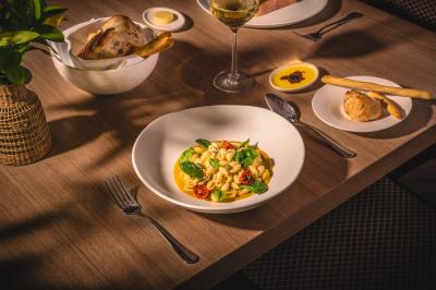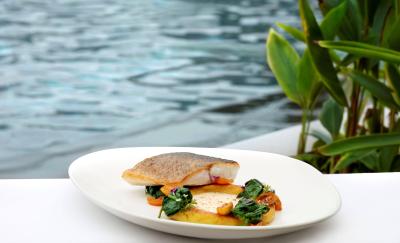 - 窓の外に広がるスタイリッシュなプールエリアを眺めながら、本格的なイタリア料理が気軽に楽しめる。
