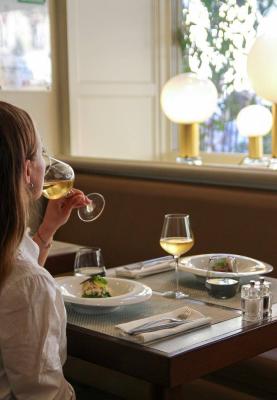 - オペラ通りに面した4ッ星ホテル内のダイニングテーブル。白を基調とした楕円型の店内で、洗練されたフランス料理が堪能できる。スタッフの行き届いたサービスも魅力。