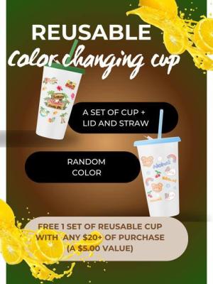 Please provide a free reusable cup with any purchase of US$20 or more. *Not valid on New years day, Thanksgiving Day, 12/24, 12/25, 12/31. Limit one per person. Cannot be combined with any other offers and promotions.