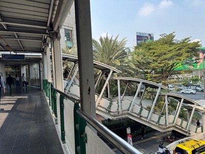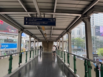 ②交差点を渡ると右側にExchange Towerが見えます。右側にある階段で地上階へ降ります。