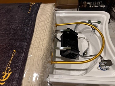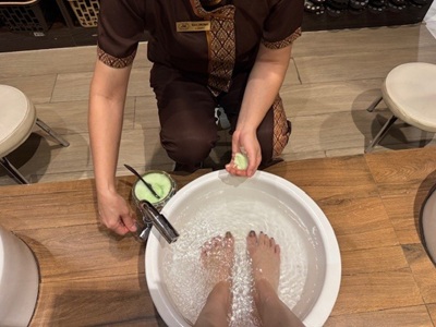 お湯の入った洗面器で足を洗うと同時に、足スクラブ、足裏のツボを軽く押してくれます。