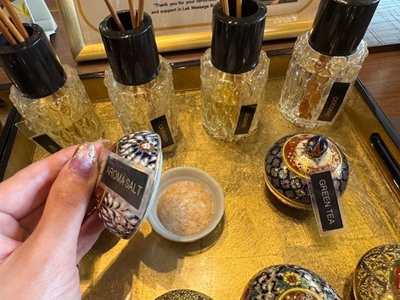 待合所で、マッサージに使用するスクラブとアロマオイルを試せます。
