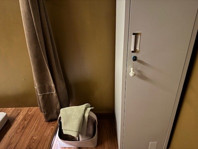 ベッドの上に着替えを入れるかごが用意されています。隣にあるクローゼットも使えます。