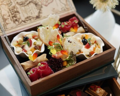 アフタヌーンティーセットは一冊の本のような木製のプレートで提供され、図書館の中でくつろいでいるような雰囲気を演出します📘