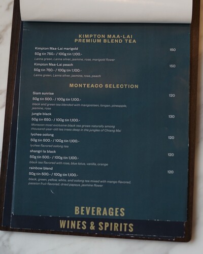 こちらでは北タイ産の紅茶ブランド「モンティーコー・ティー/MONTEACO TEA(モンスーンティー/Monsoon Tea)」を提供しています。キンプトン マーライのプレミアムブレンド2種類を含め、全部で7種類あります。