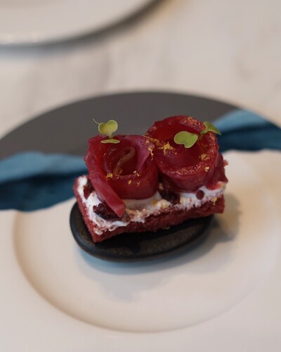 ビーツブレッドの上に、バラのように美しく巻かれたサーモンがのせられています。