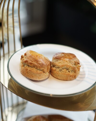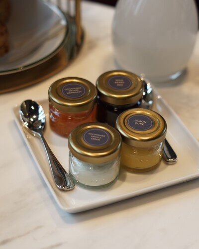 このセットには、バニラの香り豊かなスコーンとスモーキーなチポトレスコーンが含まれており、4種類のジャム&クリームと一緒に楽しめます。
